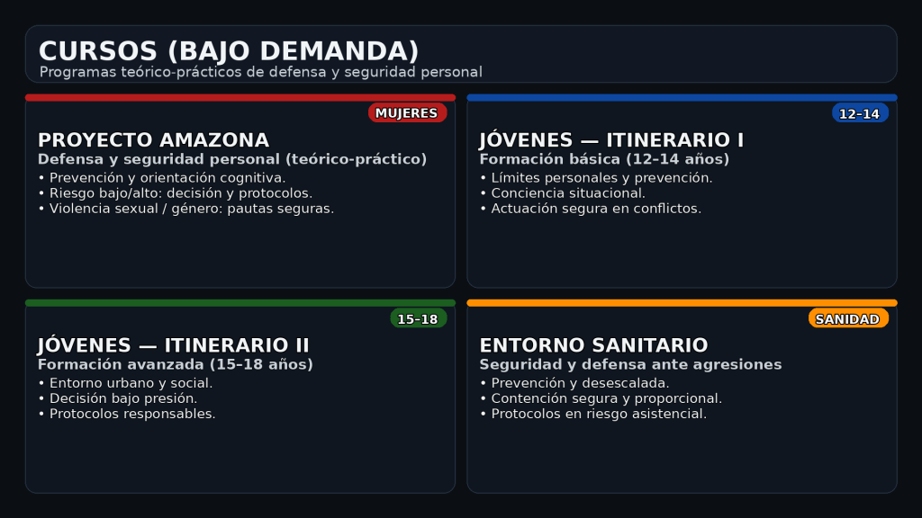 - Formación especializada en autodefensa para personal de seguridad (orientada a contextos profesionales y operativos).