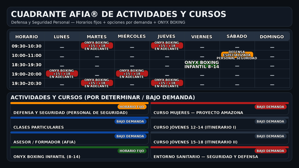- Defensa personal integral — Método AFIA© (modalidad mixta, para ambos sexos).